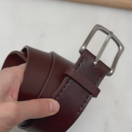 Upgrade your wardrobe with this brown leather belt, guaranteed to not need replacing for many years. Crafted from sturdy 4mm thick full-grain, vegetable-tanned leather, features a premium solid brass buckle with a matte silver finish. The edges are rounded for comfort and hand-painted and hand stitched for a refined finish. Each belt is 38mm wide.