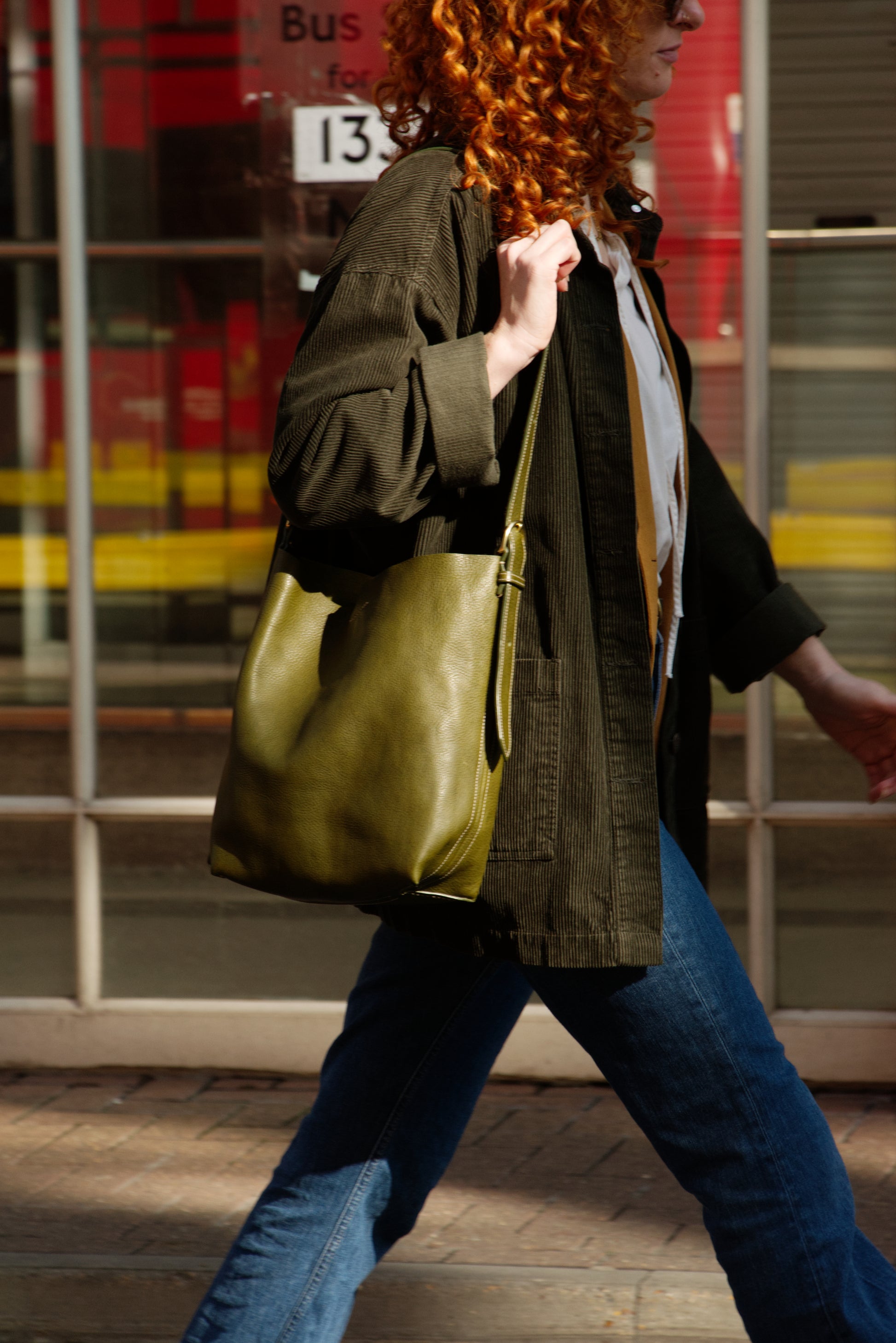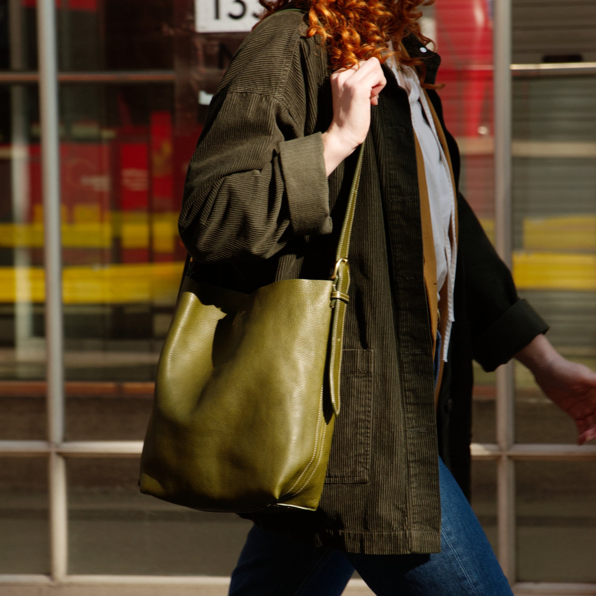 The Camellia bucket bag is made from a smooth tumbled vegetable-tanned leather with solid brass hardware. The adjustable strap allows you to wear it on the shoulder, arm or crossbody.